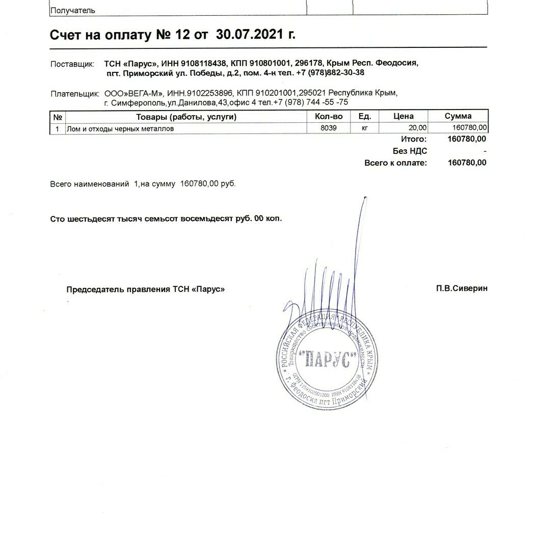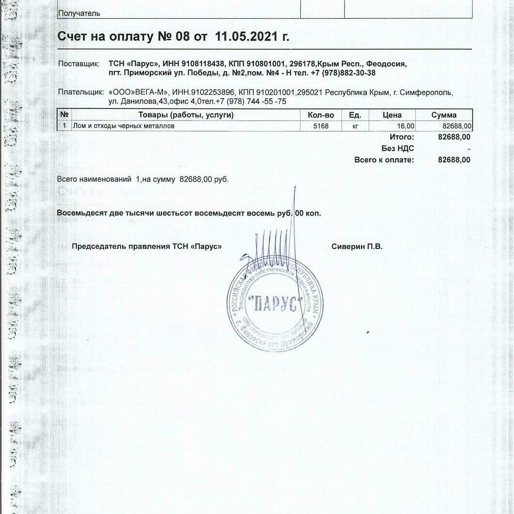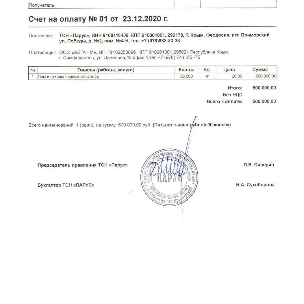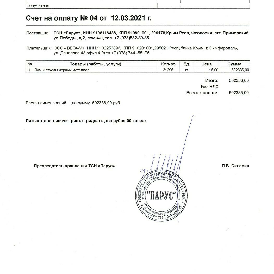 15. 20.12.2020 года был заключен договор с ООО "ВЕГА" г. Симферополь на прием лома и отходов черного металла.