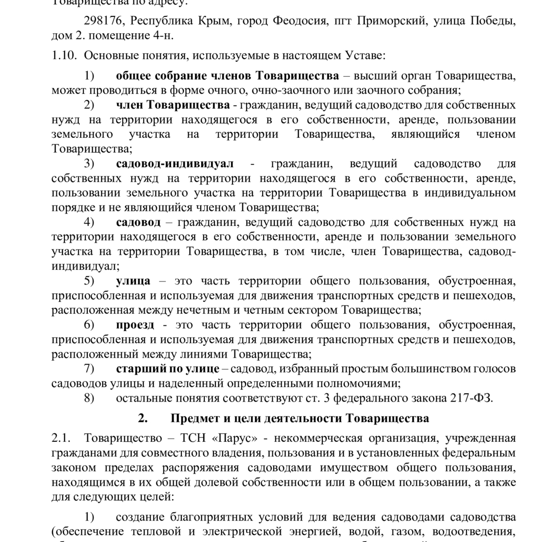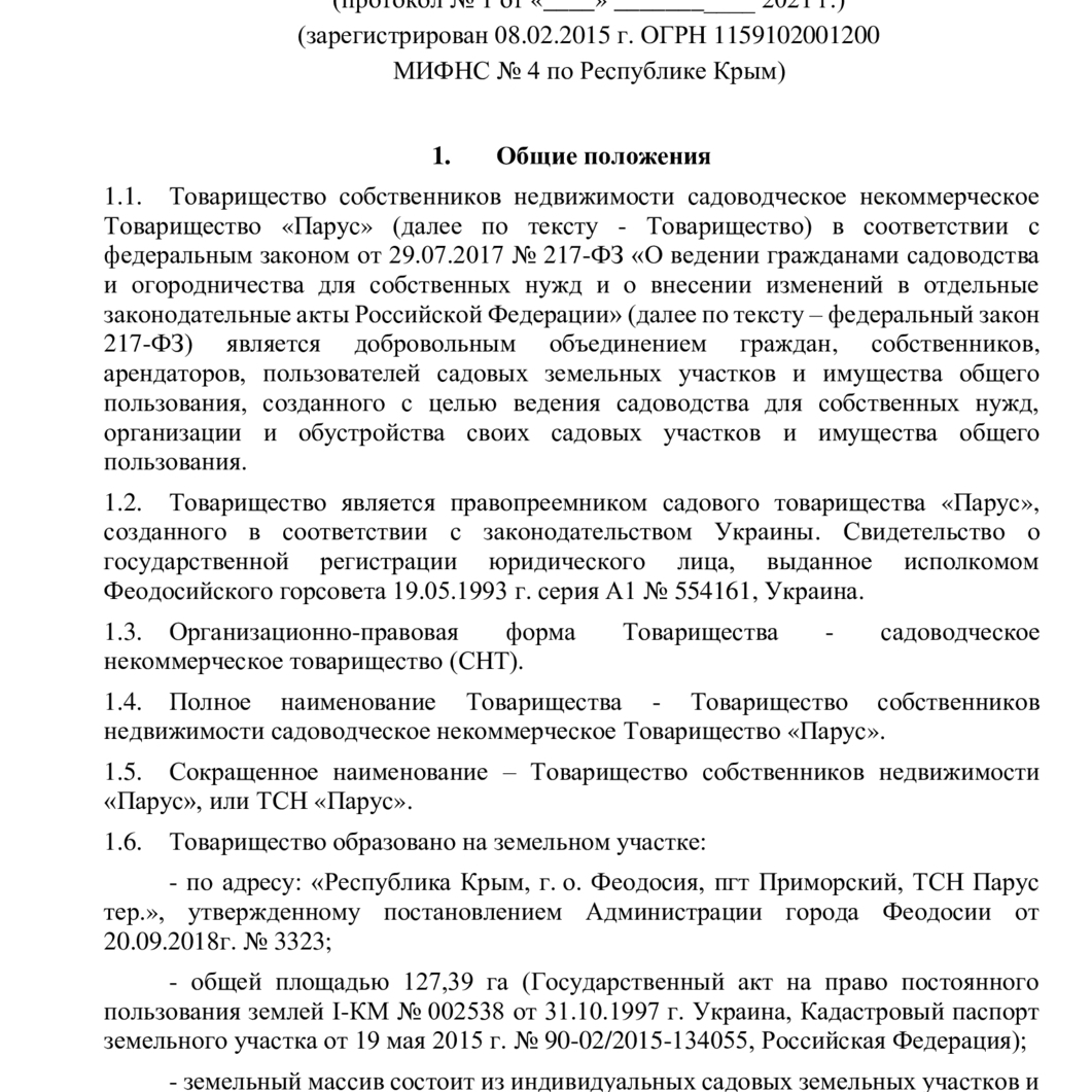 Предлагается для обсуждения членами и садоводами - индивидуалами ТСН "ПАРУС" ПРОЕКТ НОВОГО УСТАВА разработанного согласно выше указанного закона.