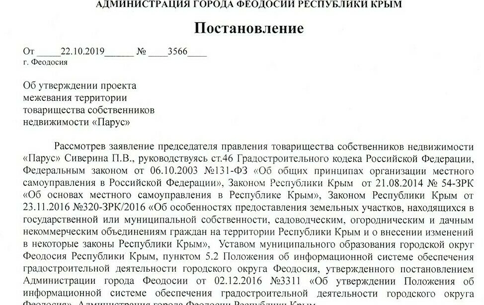 ПОСТАНОВЛЕНИЕ ОБ УТВЕРЖДЕНИИ ПРОЕКТА МЕЖЕВАНИЯ ТЕРРИТОРИИ ТСН "ПАРУС"