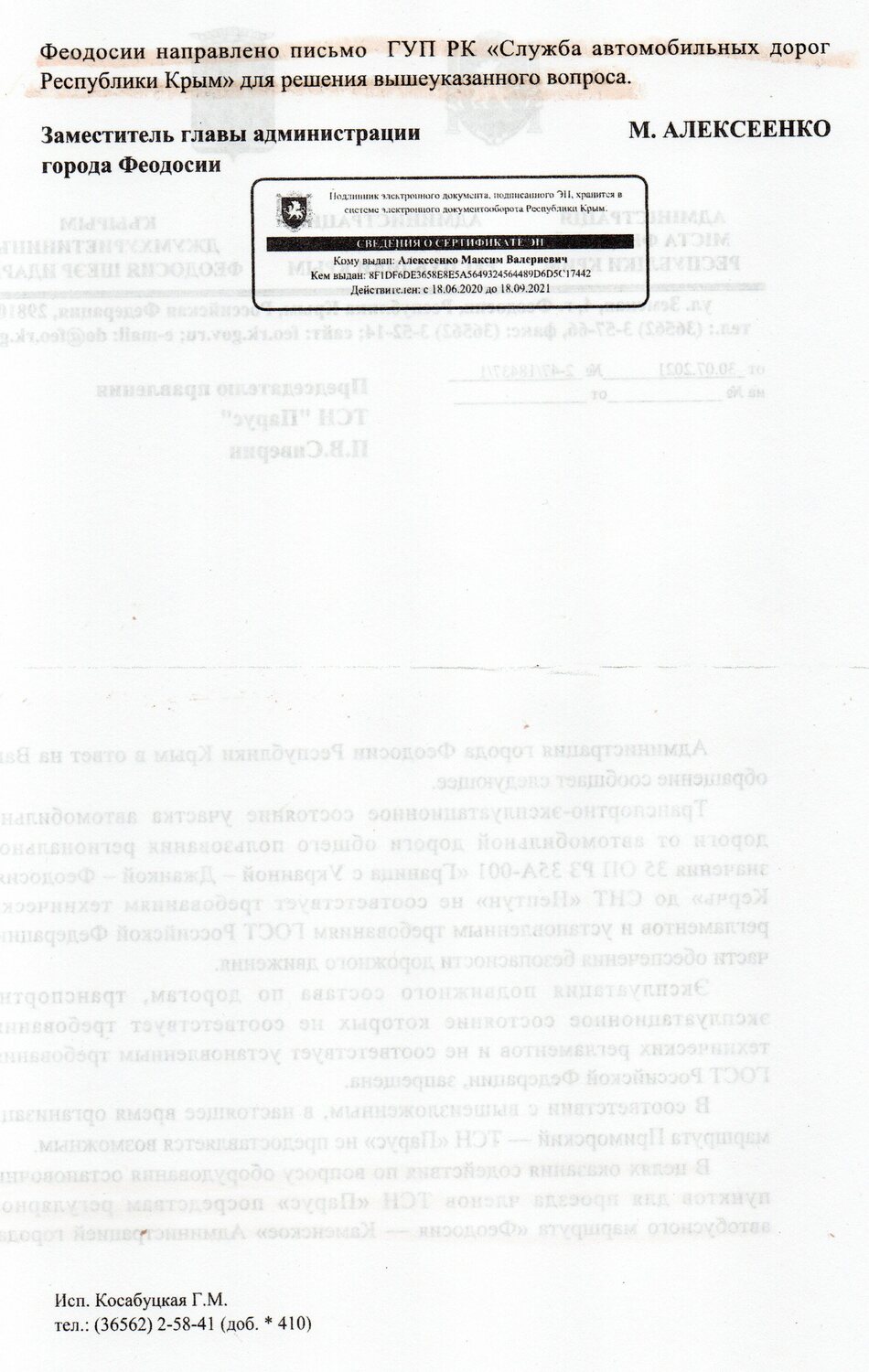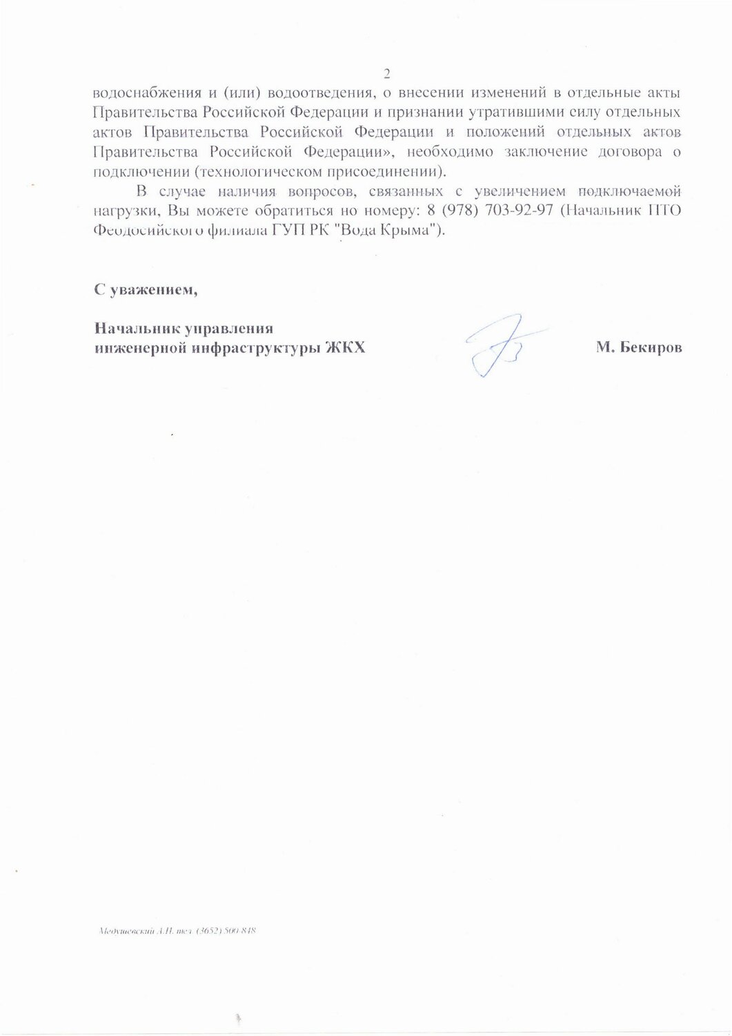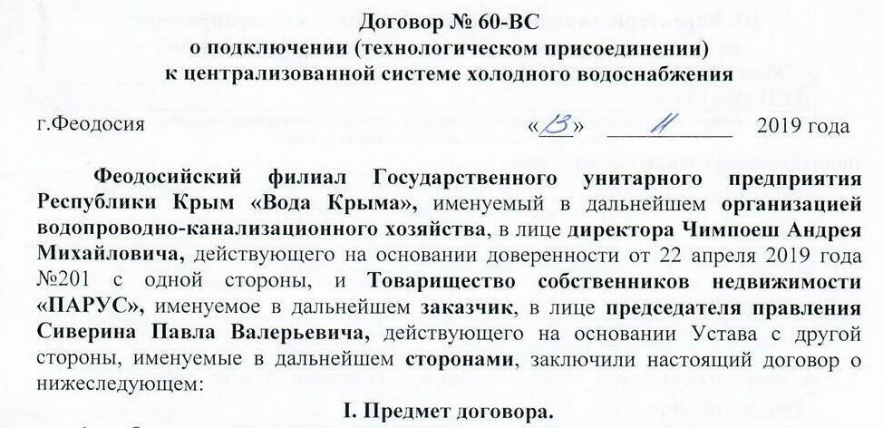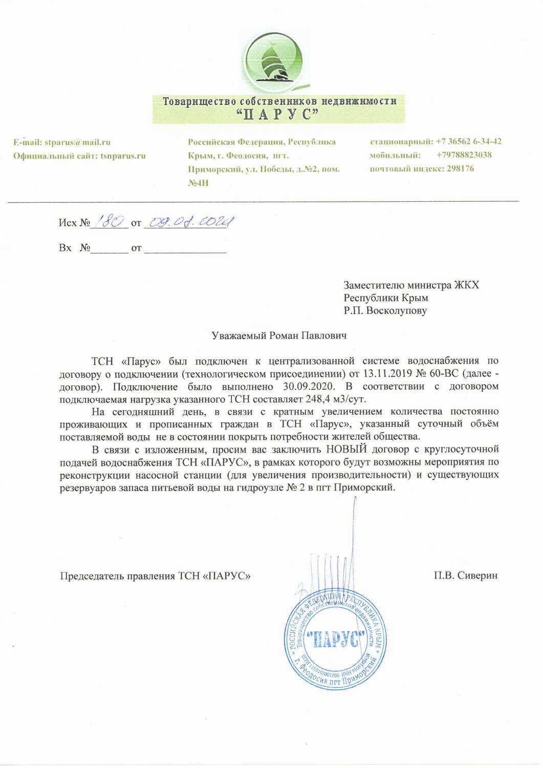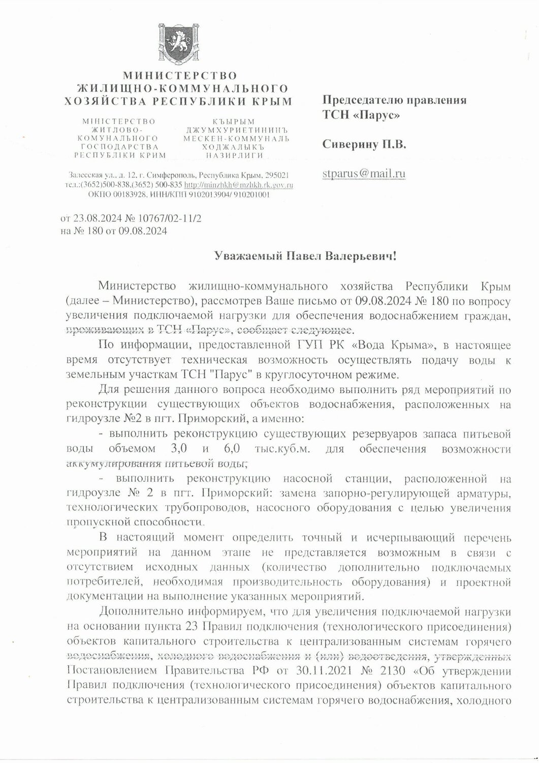 Ответ Министерства ЖКХ Республики Крым о возможности подачи круглосуточного водоснабжения на территорию ТСН "ПАРУС"