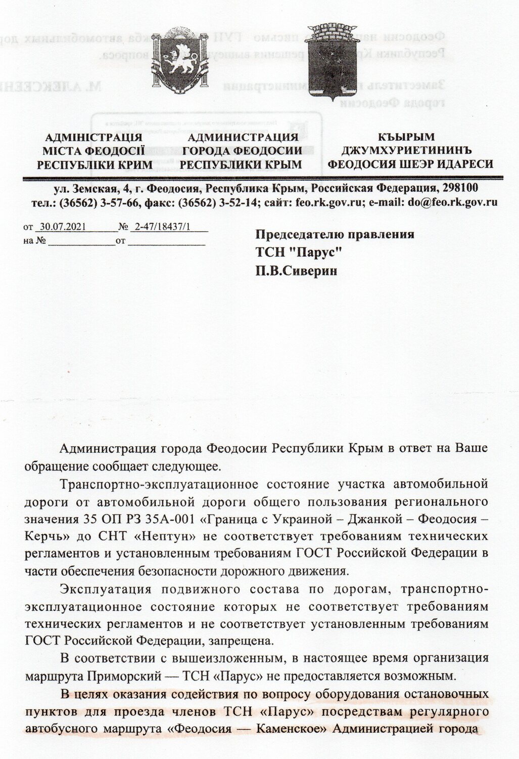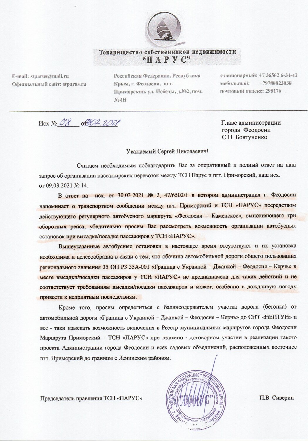В 2021 года правление по инициативе членов написала запрос на оборудования участка дороги возле ТСН "ПАРУС" автобусными остановками в сторону г. Керчь и в сторону пгт. Приморский. 2023 году появились остановки.