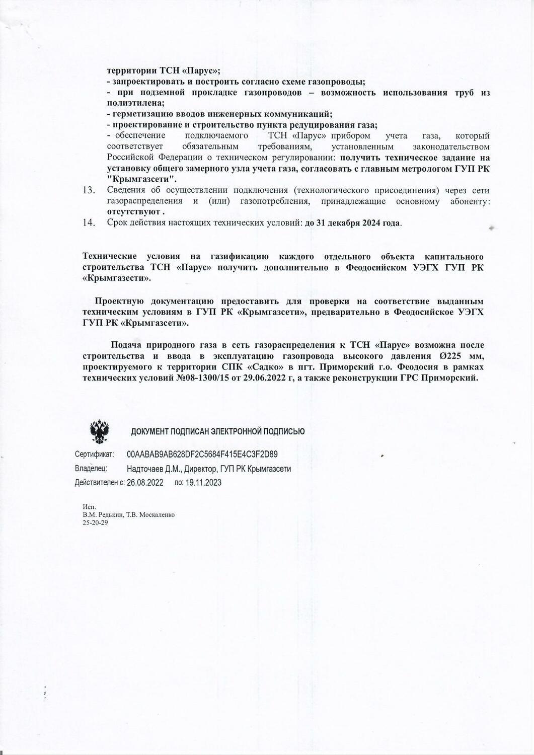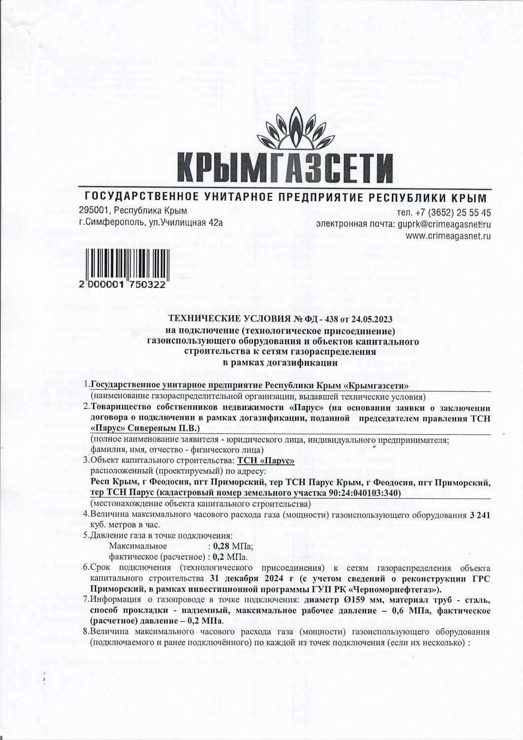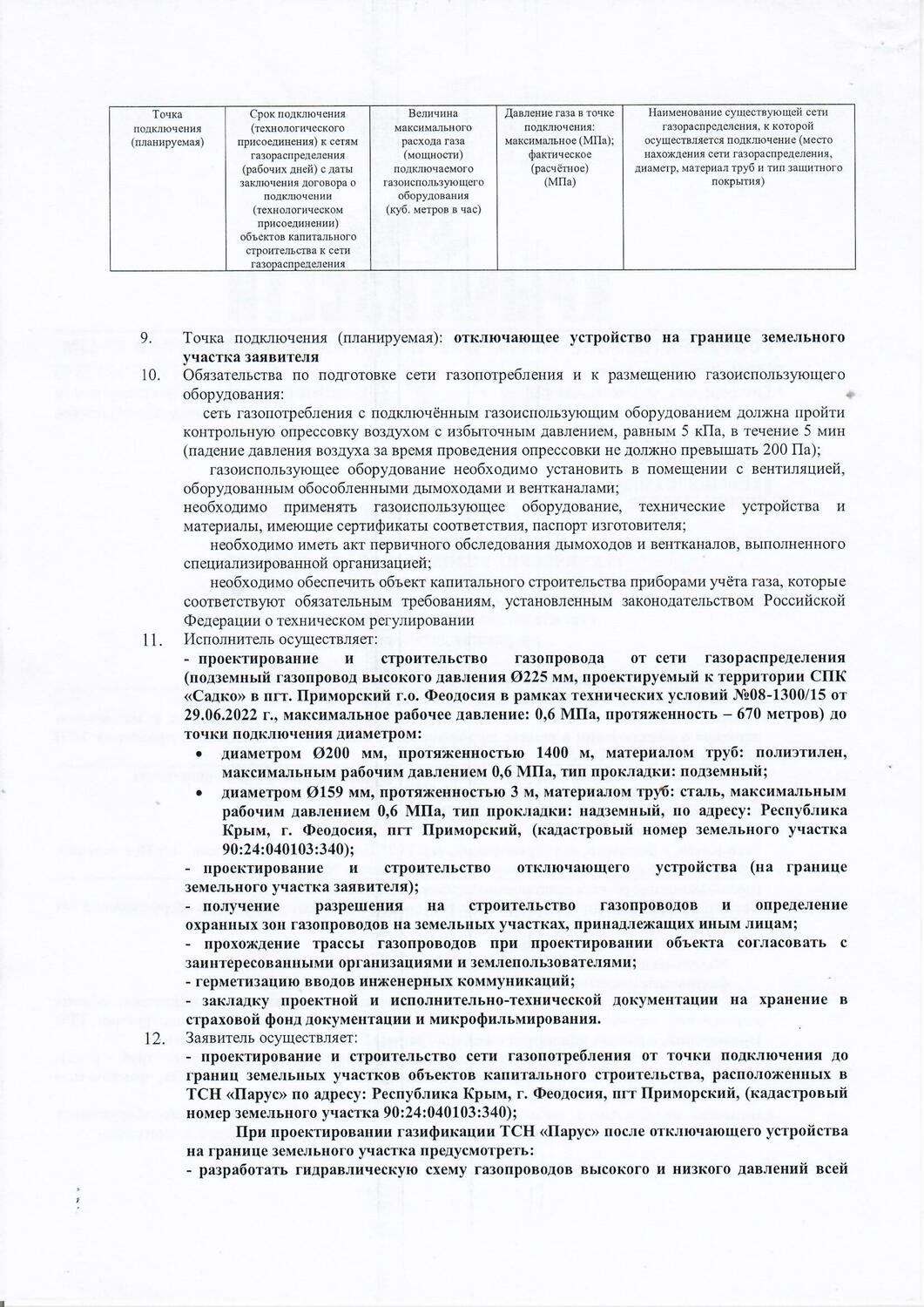 4. Разработан проект по прокладке трубопровода от пгт Приморский до территории ТСН "ПАРУС", так как трубопровод пересекает кабели ООО "Миранда-медиа", высоковольтный кабель ГУП РК "Крымэнерго", магистральный газопровод - отвод к ГТС "Приморский" ГУП РК "Черноморнефтегаз", от них получены технические условия и внесены в проект. На данный момент проект согласован с ООО "Миранда-медиа", ГУП РК "Крымэнерго", ГУП РК "Черноморнефтегаз" и ГУП РК "Вода Крыма"