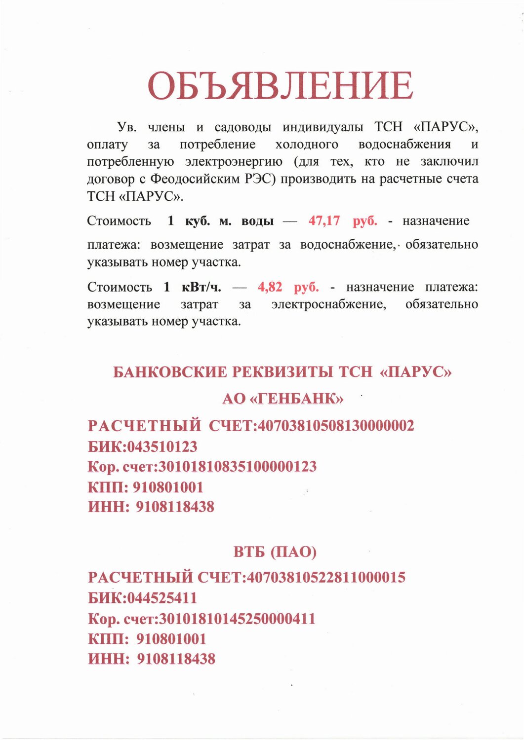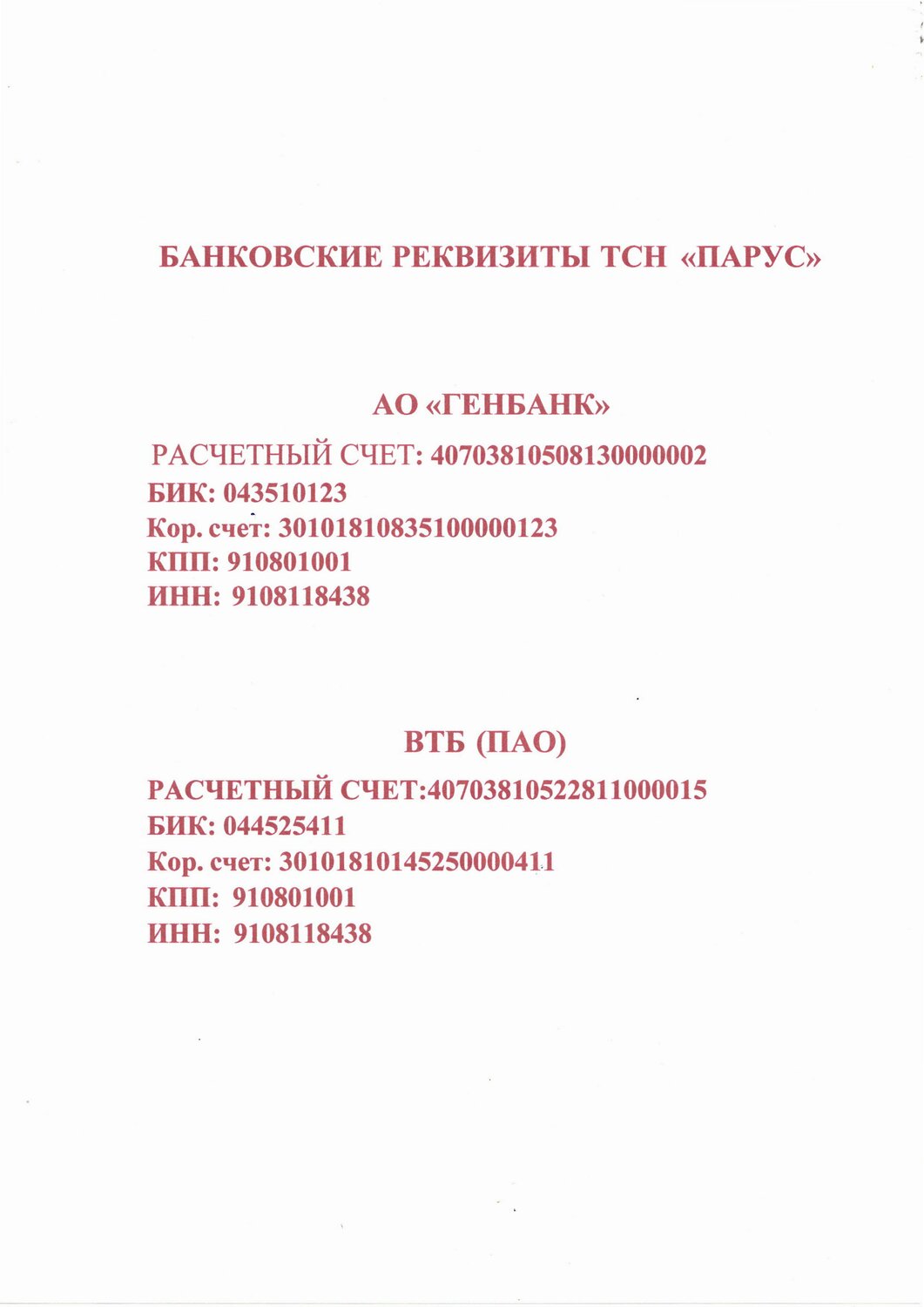 Уважаемы члены и садоводы индивидуалы ТСН «ПАРУС» , в связи с слиянием банка РНКБ (ПАО) с банком ВТБ (ПАО) с 12.06.2025 меняются банковские реквизиты ТСН "ПАРУС", так же убедительная просьба с 11.06.2025 по 17.06.2025 не производить платежи на счет банка ВТБ (ПАО) в связи с временным ограничением банковских операций. Банковские реквизиты АО "Генбанк" остаются прежними.