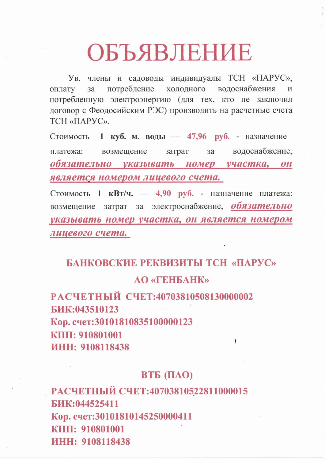 Уважаемы члены и садоводы индивидуалы ТСН «ПАРУС» , в связи с слиянием банка РНКБ (ПАО) с банком ВТБ (ПАО) с 12.06.2025 меняются банковские реквизиты ТСН "ПАРУС", так же убедительная просьба с 11.06.2025 по 17.06.2025 не производить платежи на счет банка ВТБ (ПАО) в связи с временным ограничением банковских операций. Банковские реквизиты АО "Генбанк" остаются прежними.